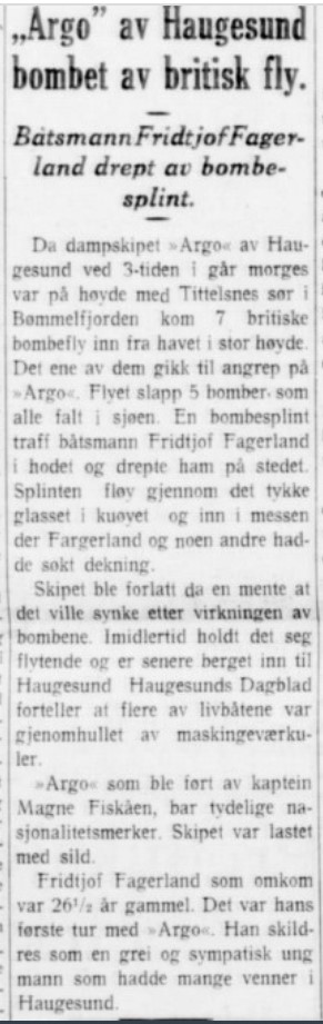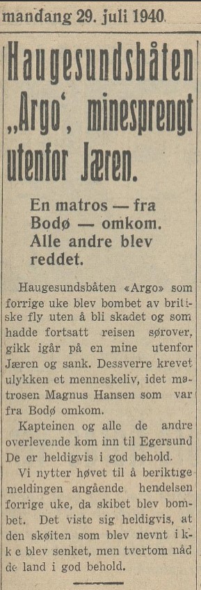 fik jeg hyre med D/S "Argo" av Stavanger Reder Ths. S. Falck. En baat paa 500 Tonn. Den var bygget av Støberi og Dok i 1898, altsaa en forholdsvis ny baat, men den daarligste sjøskib jeg har vert ombord i. Den rullet slig i sjøen at vi maatte sitte paa gulvet og ha kjørlerne i fanget. Aldrig kunne en sitte ved bordet unner fart. Det hente at den hev lanternebrettene i Sjøen saa lanternerne sluknet. Ja den var fæl i sjøen.