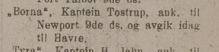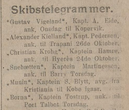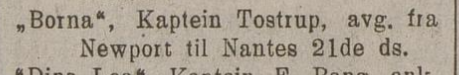 Da vi skulle gaa fra Stavanger blaaste det frisk NW kuling. Ankeret var netop letted da politiet kom langs siden. Det var et par av mandskapet der kvelden i forveien hadde vært iland og vært i slagsmaal. De blev saa tat iland og vi avgik til Amble i England og lasted kul for Fredricia i Danmark.