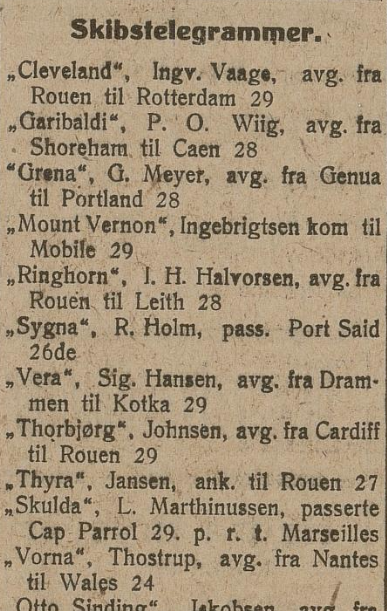 Gjorde flere turer med kul til Frankrig intil jeg 15/11-19 i Le Havre blev avløst av Olaf N. Endresen, da jeg skulle gaa til Marseile forat gaa ombord i et nyt Skib.