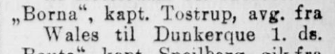 Da vi komtil Birkeland den 10/7-1919 var Kapt Karl J. Karlsen der. Karlsen som da førte D/S"Borna" var kommet til Sauda med kul fra Barry Dock. D/S "Borna" tilhørte Rederiet Odfjell. Den var bygget i Goole i 1903 og var paa 1475 ton D.W. Lasten var den første Kullast som kom til Elektrik Furnace Produxce Company.
