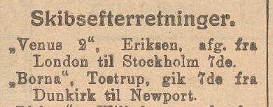 Ble fører første gang i 1919 av Borna ifølge Norske Skipsførere og ifølge Nekrologen