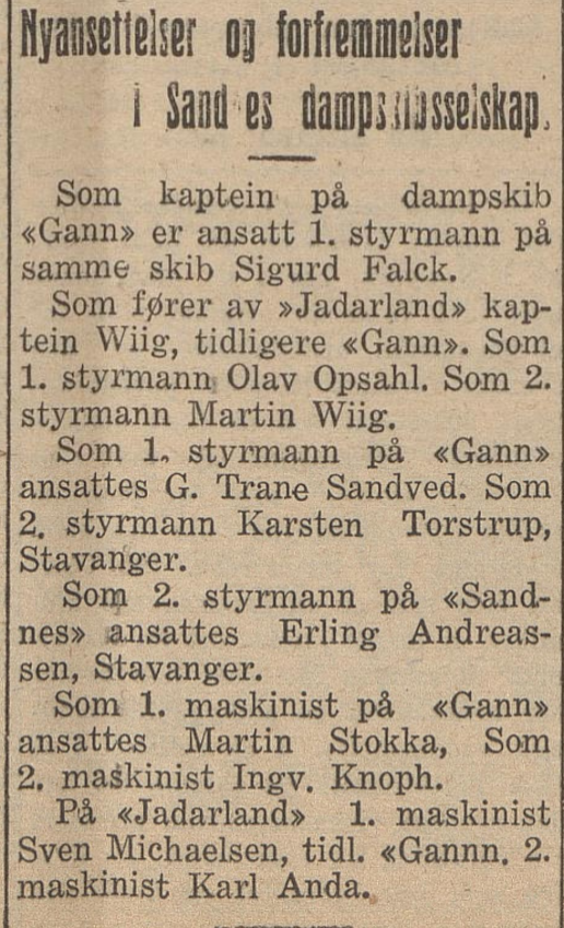 21/11-1929 ble det offentliggjort at han hadde fått jobb som havnebetjent i Stavanger
