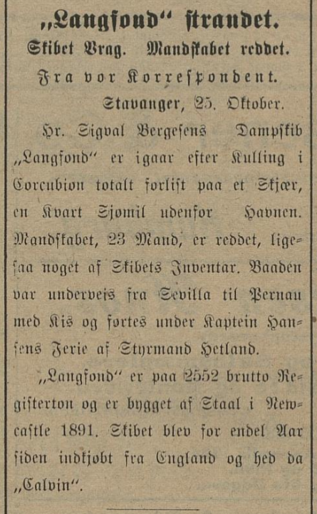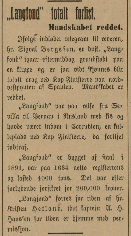Til Kap Finisterre alsaa havnen i Cordubion Bay, kom vi vel frem. Bunkret der om dagen, og da vi om efmd. Avgik og styrte udover. Straks efter gik skibet paa grunn og stod fast og blev meget læk, og sank straks efter, men var dækket over vann paa lavvann. Baatene blev sat ut, folkene gik i dem og roet iland. Styrmannen og jeg blev igjen ombord som vakt, da fiskerne var svært nærgaaende for at stjæle. Vi gik vakt ombord i vraget i 4 døgn, da der blæste op og skibet brak i to og sank paa 17 favner vann. D/S"Skuld" av Stavanger sank paa samme sted omkring 1900. Vi reddet alt vort tøi.