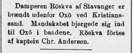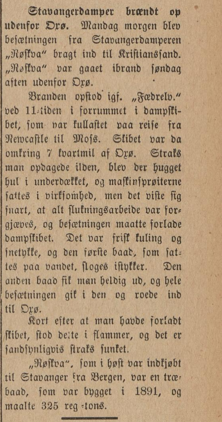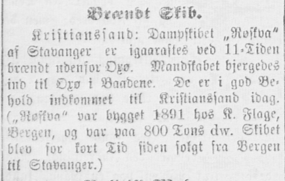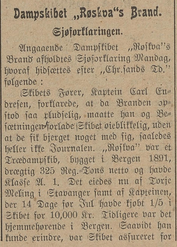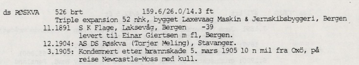 "Røskva" var paa 750 tonn DW, bygget i Bergen av Tre og skulle føres av Karl Endresen. Jeg fik Kr. 20. pr. md. i hyre.