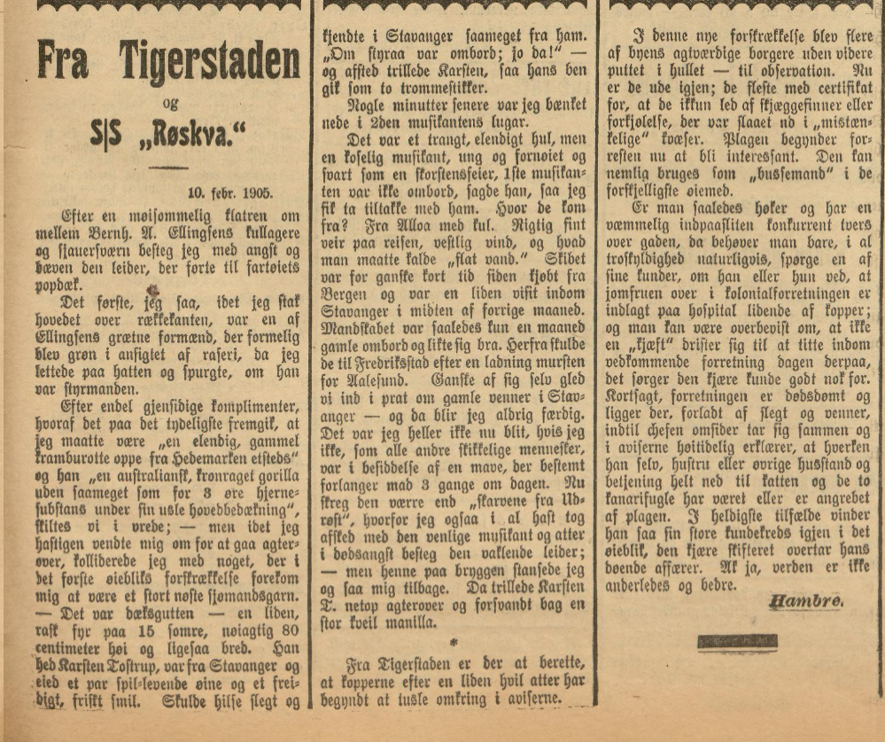 Reportasjen Karsten skrev om i sine memoarer er denne. Aftenbladet 20/2-1905